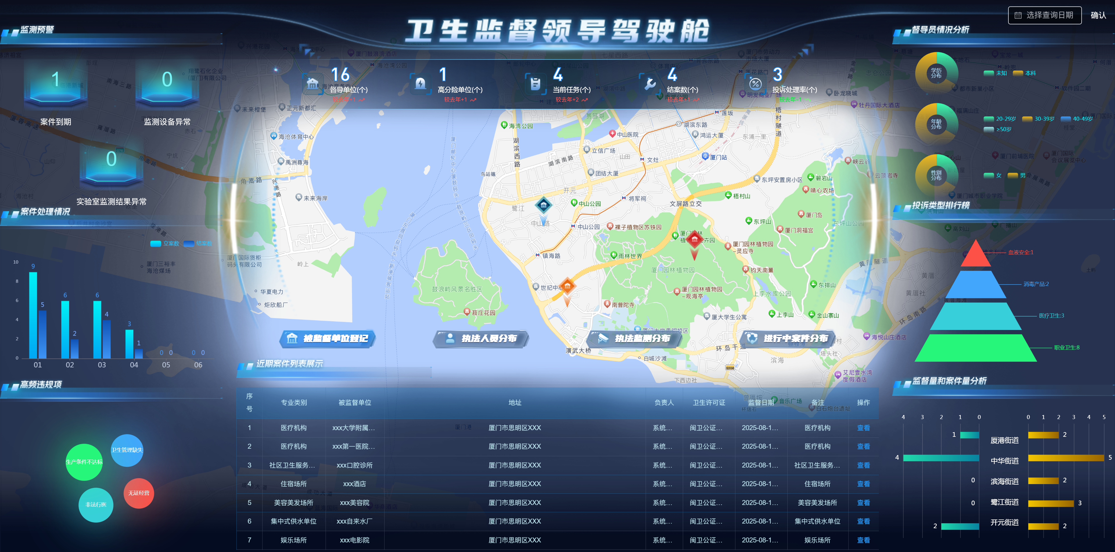 “智慧衛(wèi)監(jiān)綜合監(jiān)管服務(wù)管理系統(tǒng)”涵蓋監(jiān)督執(zhí)法應(yīng)用、非現(xiàn)場(chǎng)執(zhí)法應(yīng)用、碼上監(jiān)管、可視化駕駛艙、信息交換系統(tǒng)等內(nèi)容,實(shí)現(xiàn)加強(qiáng)衛(wèi)生監(jiān)督綜合執(zhí)法能力建設(shè),依法推進(jìn)衛(wèi)生監(jiān)督工作,不斷創(chuàng)新衛(wèi)生監(jiān)督執(zhí)法手段,提高衛(wèi)生監(jiān)督的監(jiān)管和應(yīng)急處置水平,通過(guò)建設(shè)智慧衛(wèi)監(jiān)系統(tǒng),將傳統(tǒng)現(xiàn)場(chǎng)監(jiān)管與非現(xiàn)場(chǎng)物聯(lián)網(wǎng)智能監(jiān)督監(jiān)測(cè)手段相結(jié)合,解決目前衛(wèi)生監(jiān)督機(jī)構(gòu)無(wú)法及時(shí)掌握和處置突發(fā)狀況的問題,做到在第一時(shí)間獲取現(xiàn)場(chǎng)數(shù)據(jù),在事件發(fā)生、升級(jí)前提前預(yù)警和處置,提高執(zhí)法效率。